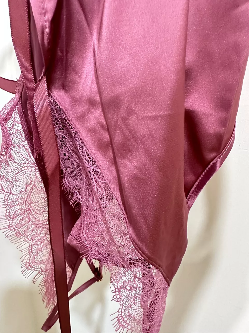 此款睡衣選用柔滑不易發皺的絲質緞面布料,帶有自然的光澤感非常有質感,胸前搭配魅惑的睫毛蕾絲,從褲子到背部都非常迷人~讓對方可以窺探的胸前縷空蝴蝶綁帶設計,情趣滿滿,感情加溫,褲子是開檔設計,穿脫方便。