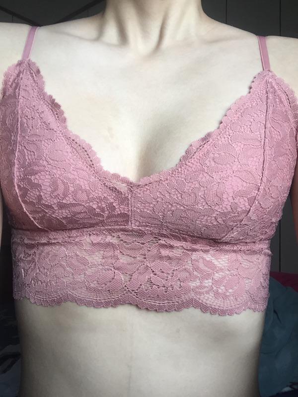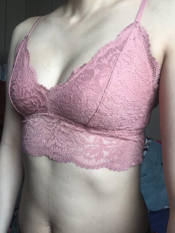 平常穿75C,上胸無肉,這款包覆性很棒,不論下圍鬆緊度或是整體質感都相當良好,如果穿著睡覺了也很ok,照片中的內衣是沒有薄墊的,可以看出來她集中包覆性能相當良好,個人覺得賣家照片沒有色差唷!背心式內衣對我而言比較難穿脫,但是蕾絲樣式實在太美了,我可以接受這個小遺憾。。